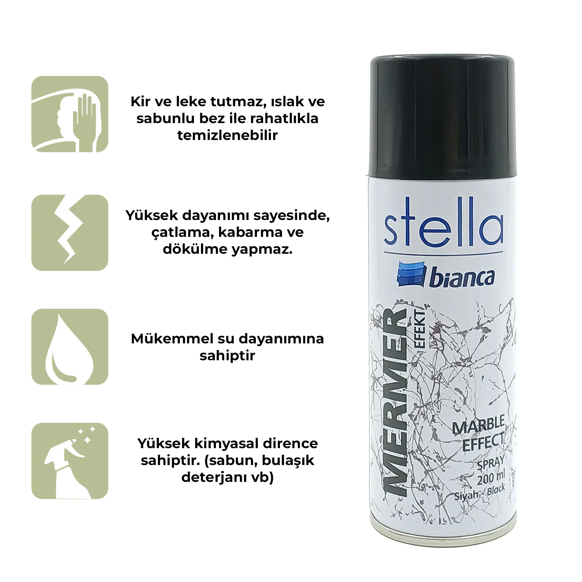 Bianca Stella Mermer Efekt Sprey Boya, farklı yüzeylere dekoratif mermer görünümü kazandırmak için geliştirilmiştir. Kağıt, karton, ahşap, cam, metal, seramik, porselen, taş ve benzeri birçok yüzeyde kullanılabilir. Kullanımı kolaydır, uygulama sonrasında yüzeye şık ve doğal bir mermer dokusu verir.