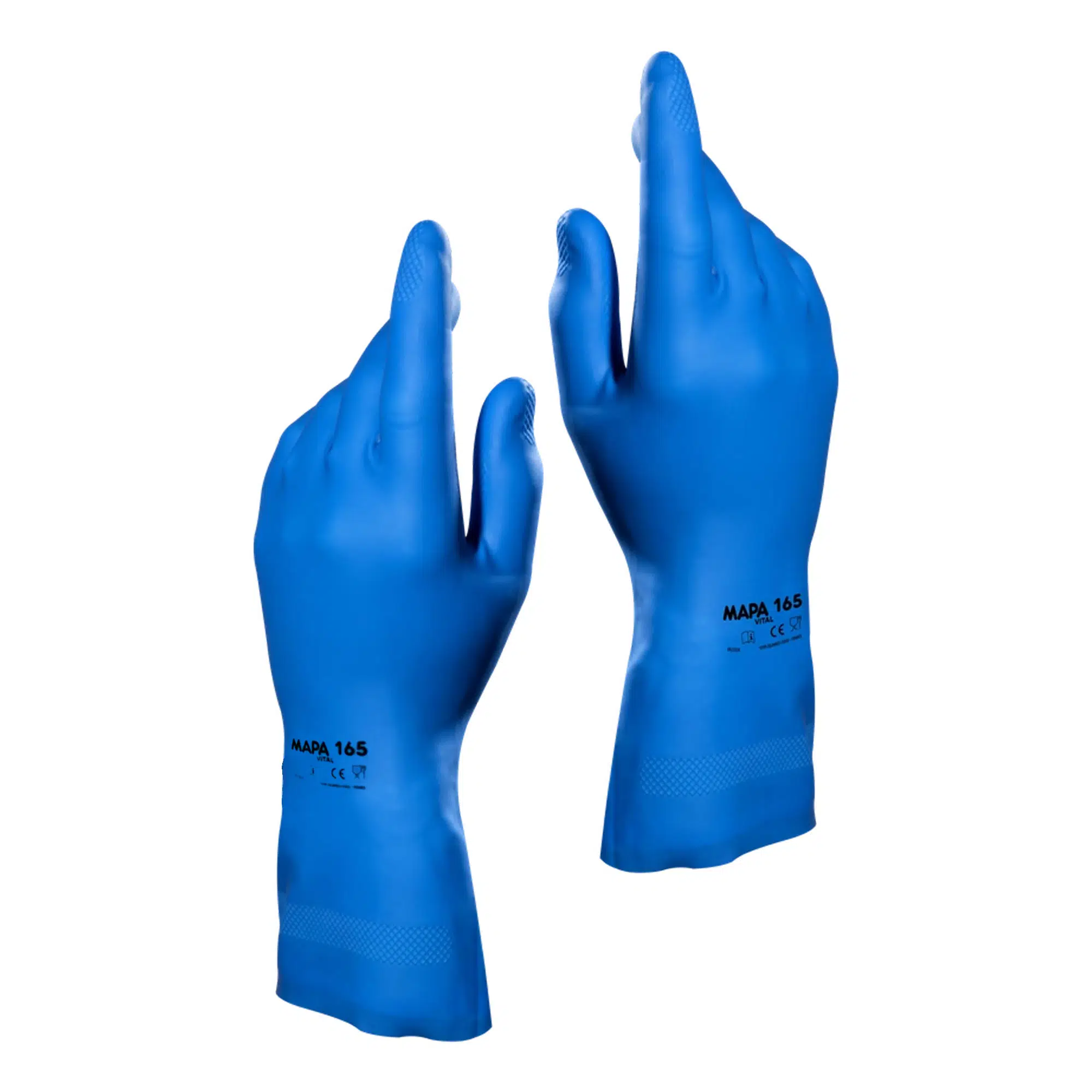 Superfood 165 olarak da bilinen Vital 165 gıda teması eldiveni, doğal lateks yapısıyla hem yüksek esneklik hem de sıvı geçirmez koruma sağlar. Yaklaşık 0,29 mm kalınlığında ve 30,5 cm uzunluğundadır. İç yüzeyinde pamuk flok astar mevcuttur; bu astar teri emer ve eli konforlu tutar. Dış yüzeyindeki kabartmalı doku, kaygan yüzeylerde güvenli tutuş sağlar.