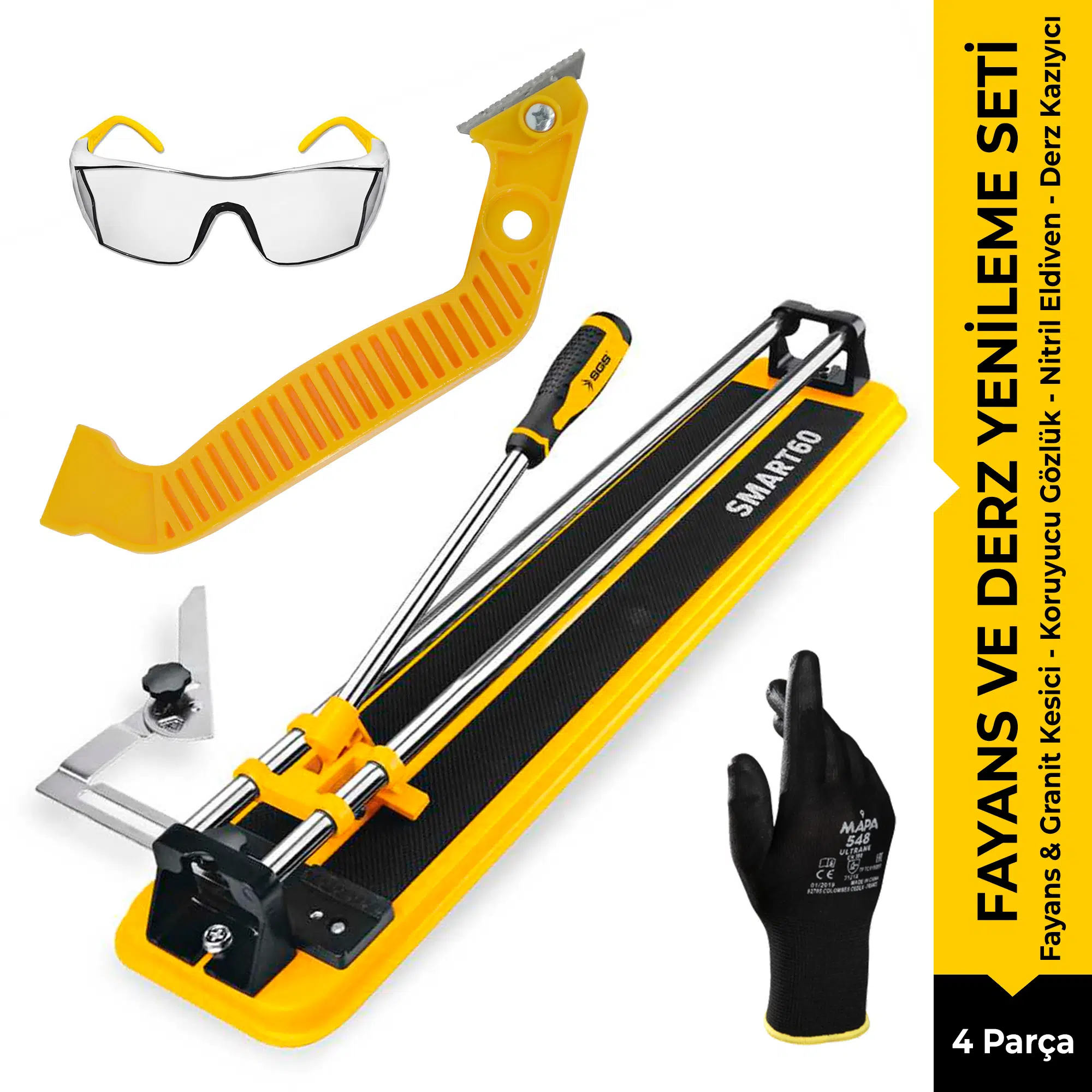 SGS Plus 4 parça ekonomik fayans granit yenileme seti! SGS Smart 60 (133) kesme makinesi, derz kazıyıcı, gözlük ve MAPA 548 eldiven bir arada. En zorlu tadilatlar için profesyonel çözüm.